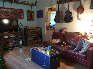 So today I thought I'd show some pictures of my tiny house. This is the inside of the front door. You can see my Art Doll cabinet and my Hello Kitty guitar. One of my fish tanks and the Sunflower linen curtains I made. I think my house is quite large for a tiny house. I have lots of room. I tried to get pictures that conveyed a sense of the roominess. But it is difficult to take nice photos in a small space.